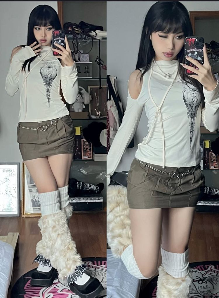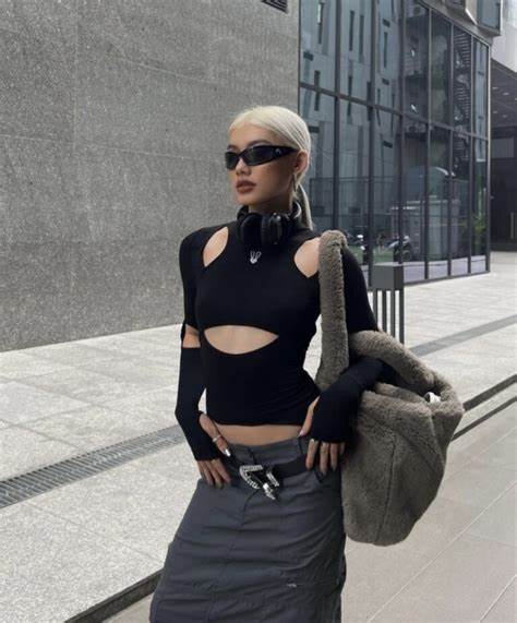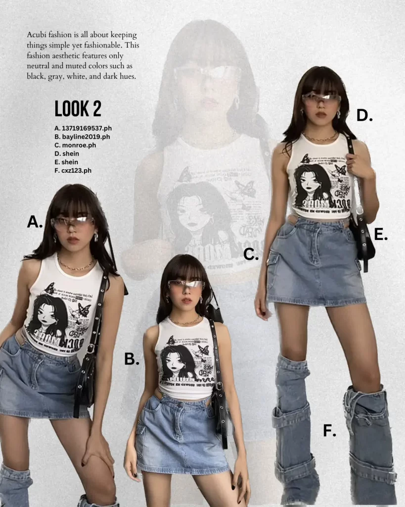 Acubi commonly features oversized clothing, muted tones, graphic baby tees, and mesh tops